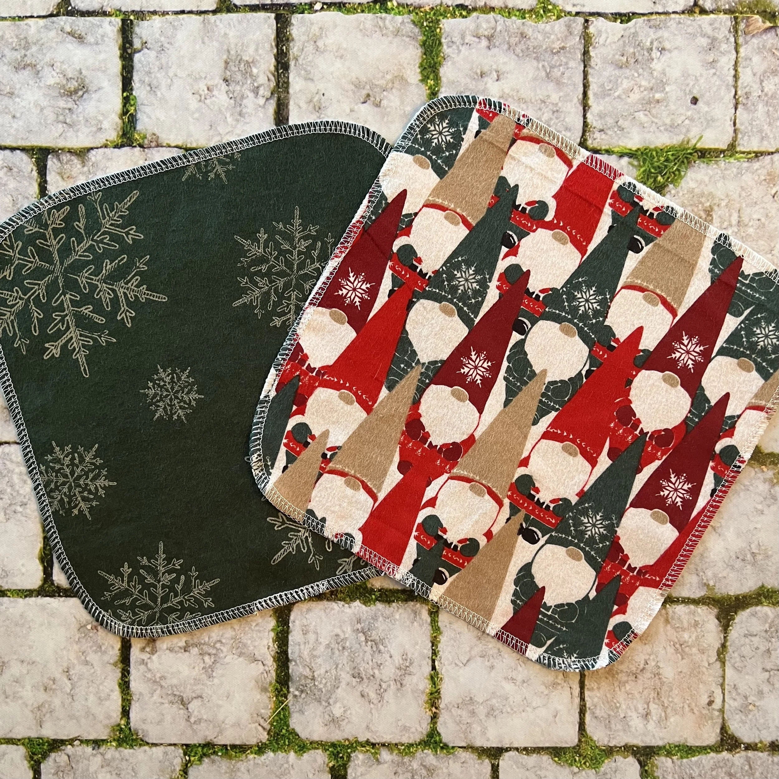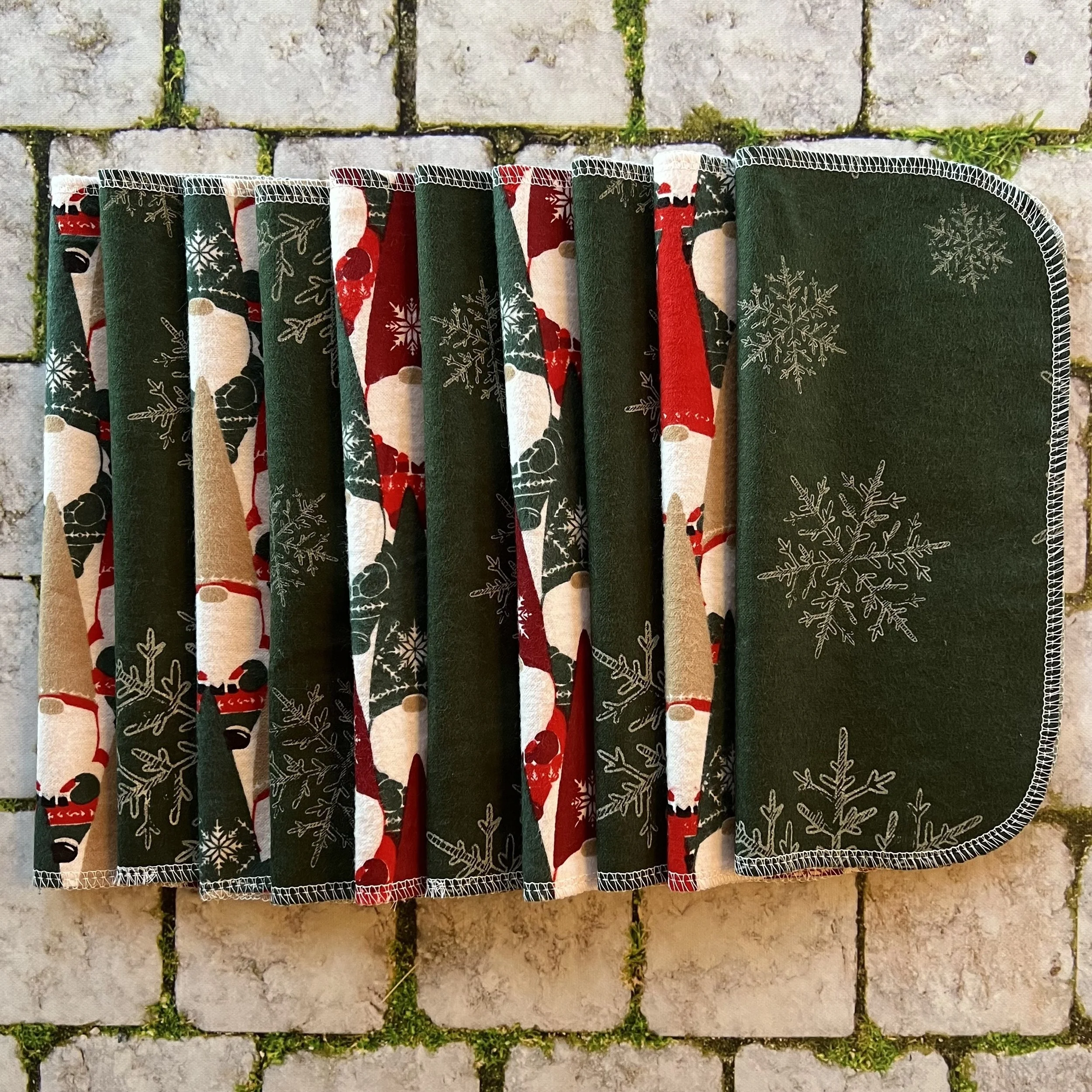 Made from 100% cotton flannel. Each towel is 10×10 inches.